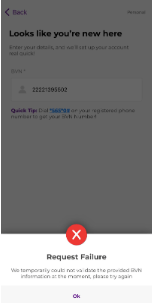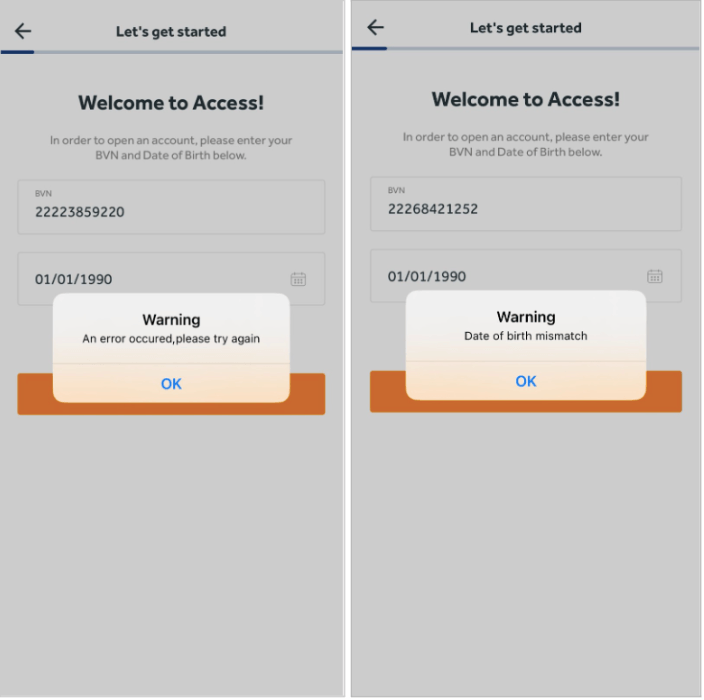 Access Bank's security measures are commendable as they do not accept randomly generated BVNs, or BVNs that do not match the customer's provided date of birth. An example is shown below where the date of birth entered did not match the BVN provided.