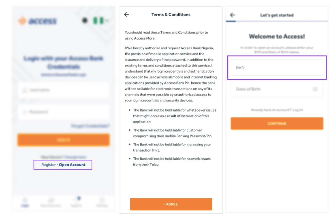As shown below, Access bank allows its customers to open a new bank account on their mobile app. The bank also has the compulsory requirement of agreeing to their terms and conditions, followed by the mandatory request of the BVN and date of birth to continue the process.