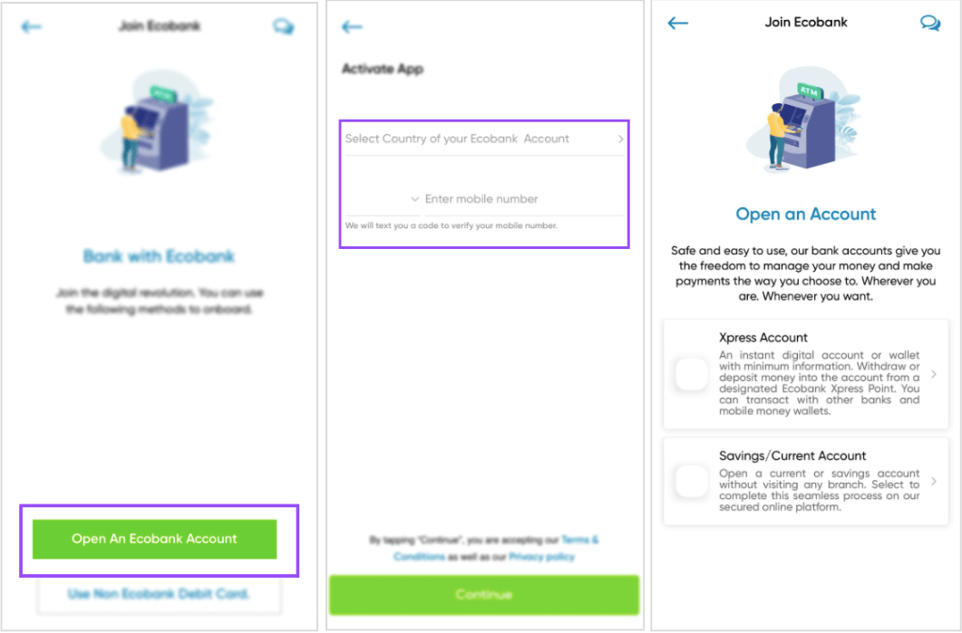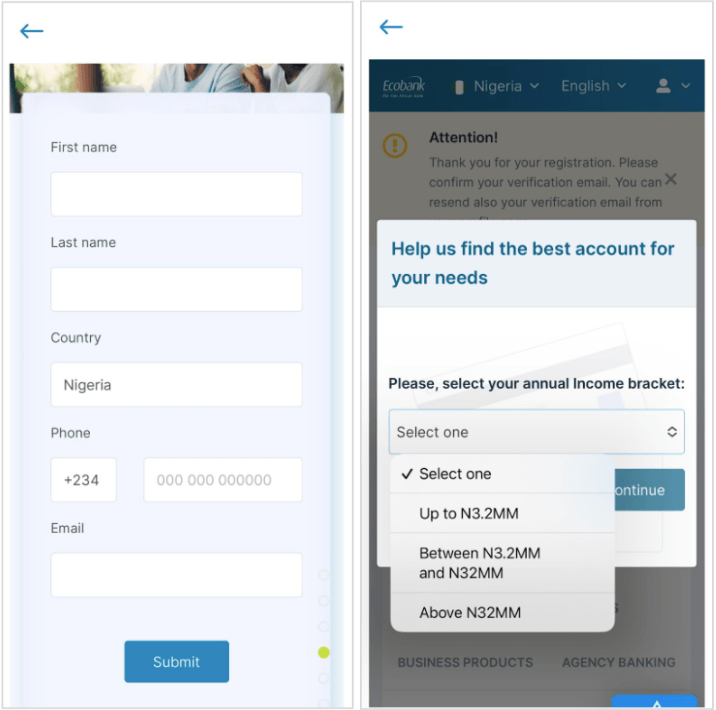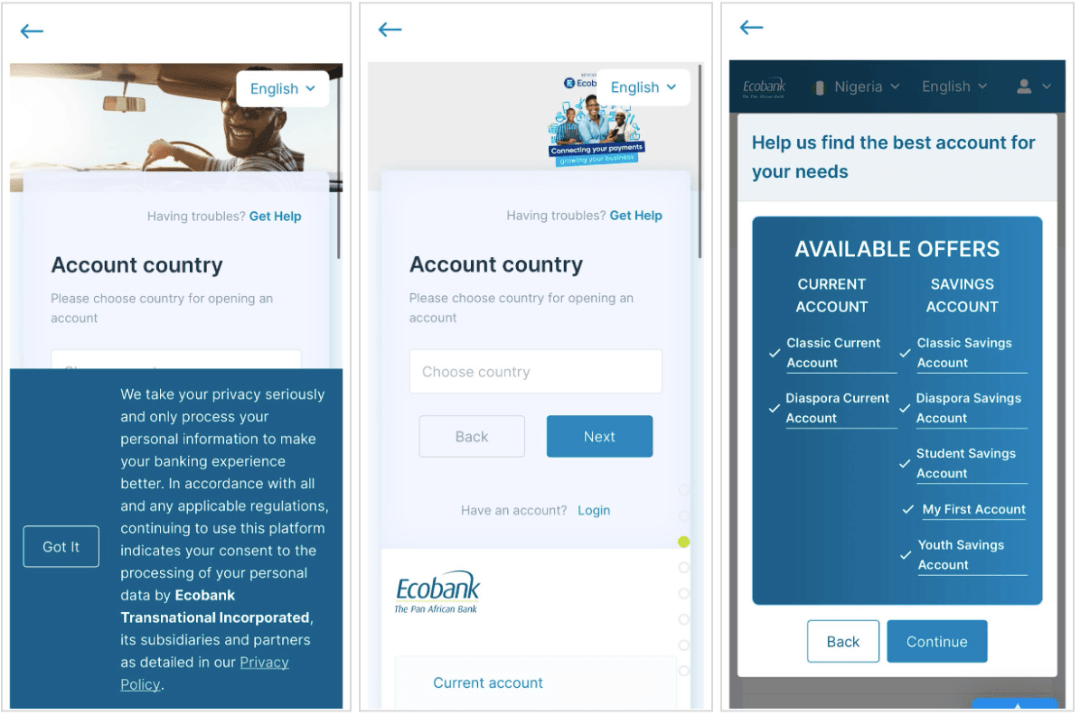 Ecobank allows its customers to open a new bank account on the mobile app. Being a Pan African bank, multiple requests were made to indicate the customer’s country (these screens were skipped). As shown below, there was no request for the customer’s Bank Verification Number. The focus was on phone number (repeated requests were made), name, email address and location.