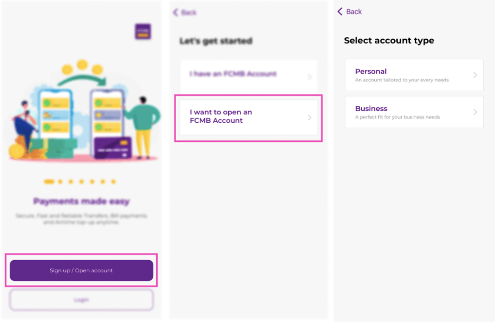 FCMB has an ‘open account’ button on the first screen you land on. The bank allows a customer to open two types of accounts - personal and business. A BVN number is required once a customer chooses a personal account.