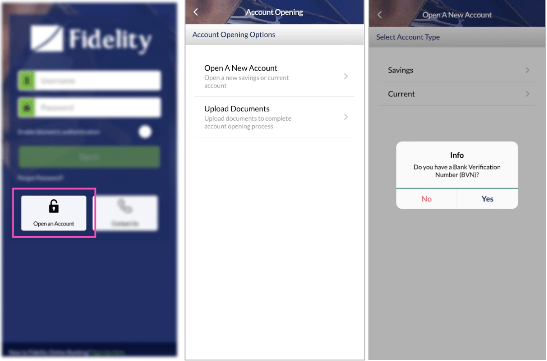Fidelity bank has the option to open an account on their mobile app. They also, from the onset, show the types of accounts their customers can open on the app. BVN was requested soon enough, but didn’t go through even after multiple attempts with different BVNs.
