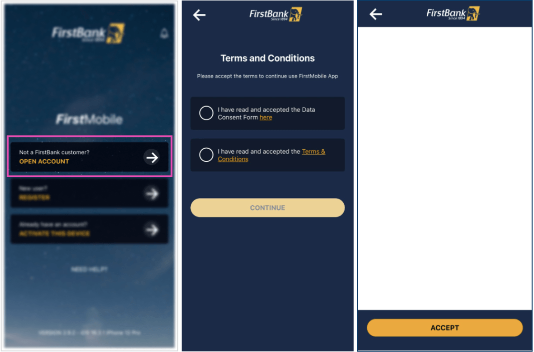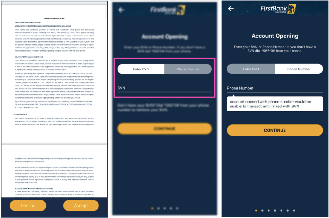 First bank has the option to open an account on its mobile app. After the requirement of accepting its “Data Consent Form” and “Terms & Conditions”, the app requests a BVN before continuing. There is an option to use a phone number instead of BVN, but it is clearly stated that an account opened with a phone number would be unable to transact, until linked with a BVN.