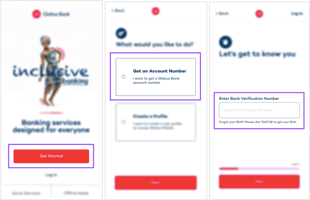 After downloading Globus bank’s mobile app, one can “Get an Account Number” or “Create a Profile”. The bank promptly requests a BVN and it is commendable that the number of steps to be taken to set up the account are clearly indicated. The app also rejected a randomly generated BVN.