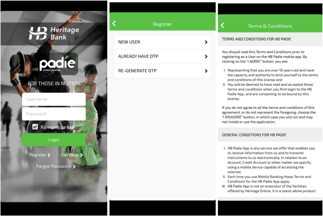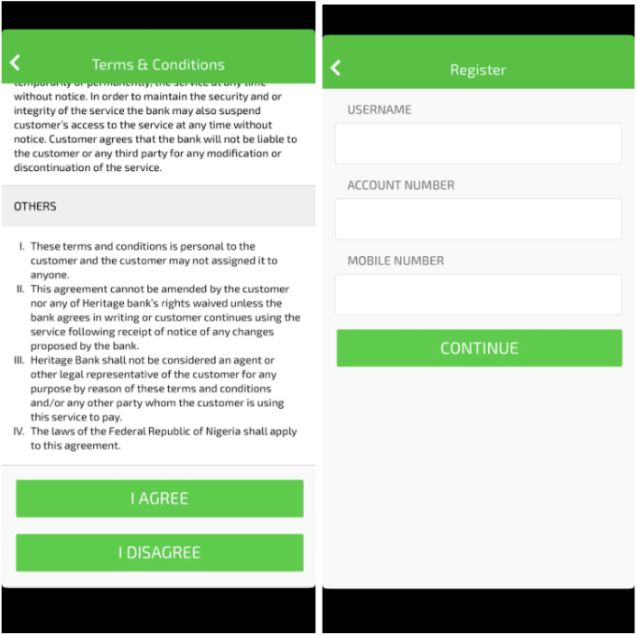 Heritage bank does not provide customers the option to open an account on their mobile app. The process requires accepting the bank’s terms and conditions before registering your existing account. This implies that to open an account, one has to go to a physical Heritage bank branch.