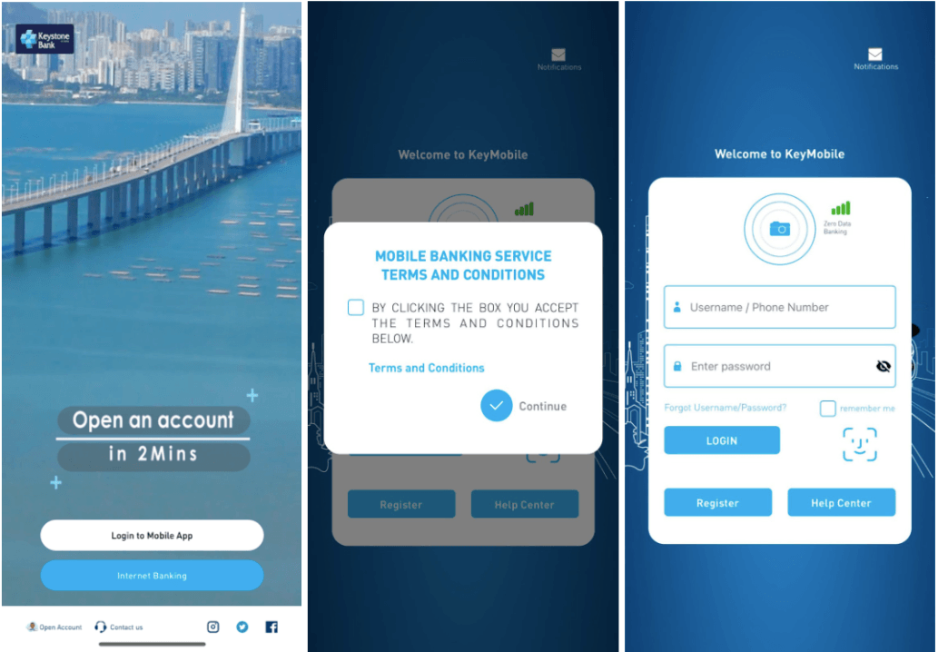 Keystone bank’s mobile app advertises “open an account in two minutes” on the first screen you land on. But the option to actually open a new account with the bank is hidden and can only be found after multiple clicks/screens.