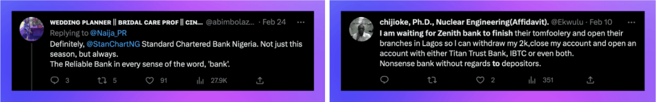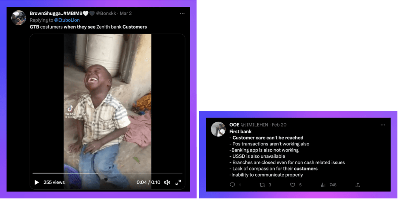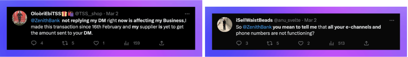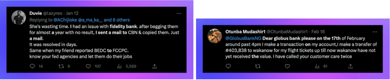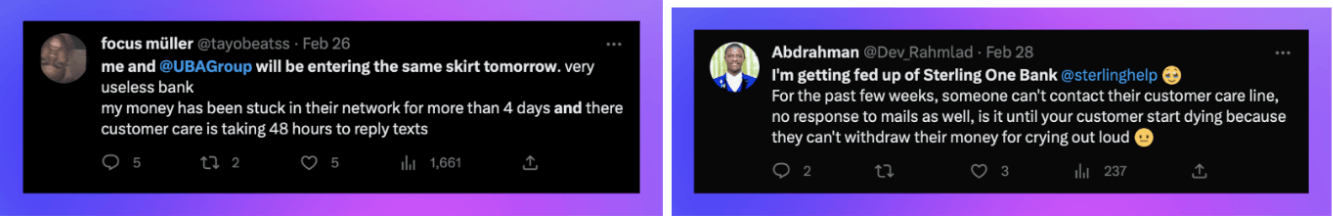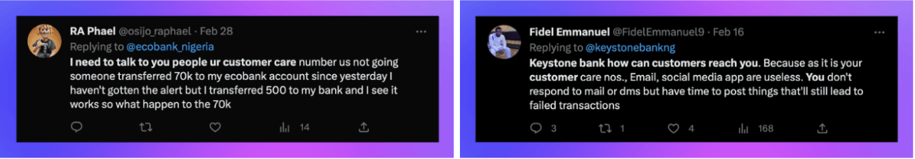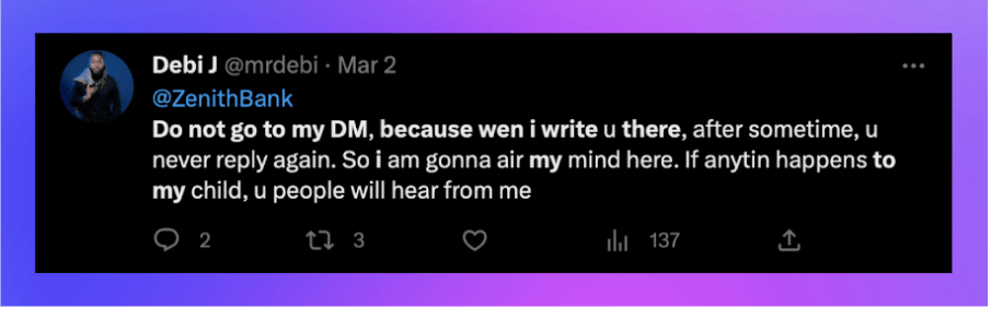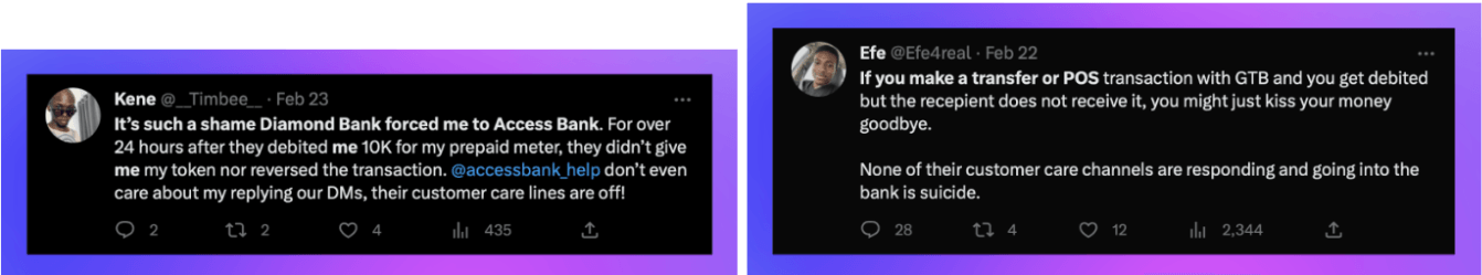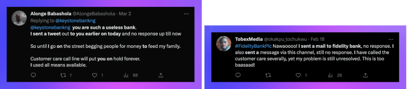 In recent times, there has been an increase in the number of complaints from customers directed towards Nigerian banks on Twitter. Unfortunately, the banks in question seem less responsive to these complaints, with the general trend being to deflect with a general apology or wait for the situation to blow up before addressing it. It is possible that this lack of responsiveness is due to the law of diminishing returns. The banks that have been frequently mentioned in these complaints are Guarantee Trust Bank, Access Bank, UBA, and Zenith Bank. Customers have been voicing concerns about issues such as failed transactions without a reversal, wrong debits, and the lack of effective response or solution from the bank's customer care staff online. Additionally, long queues at the bank have also been a common issue for customers seeking to sort out their banking problems.