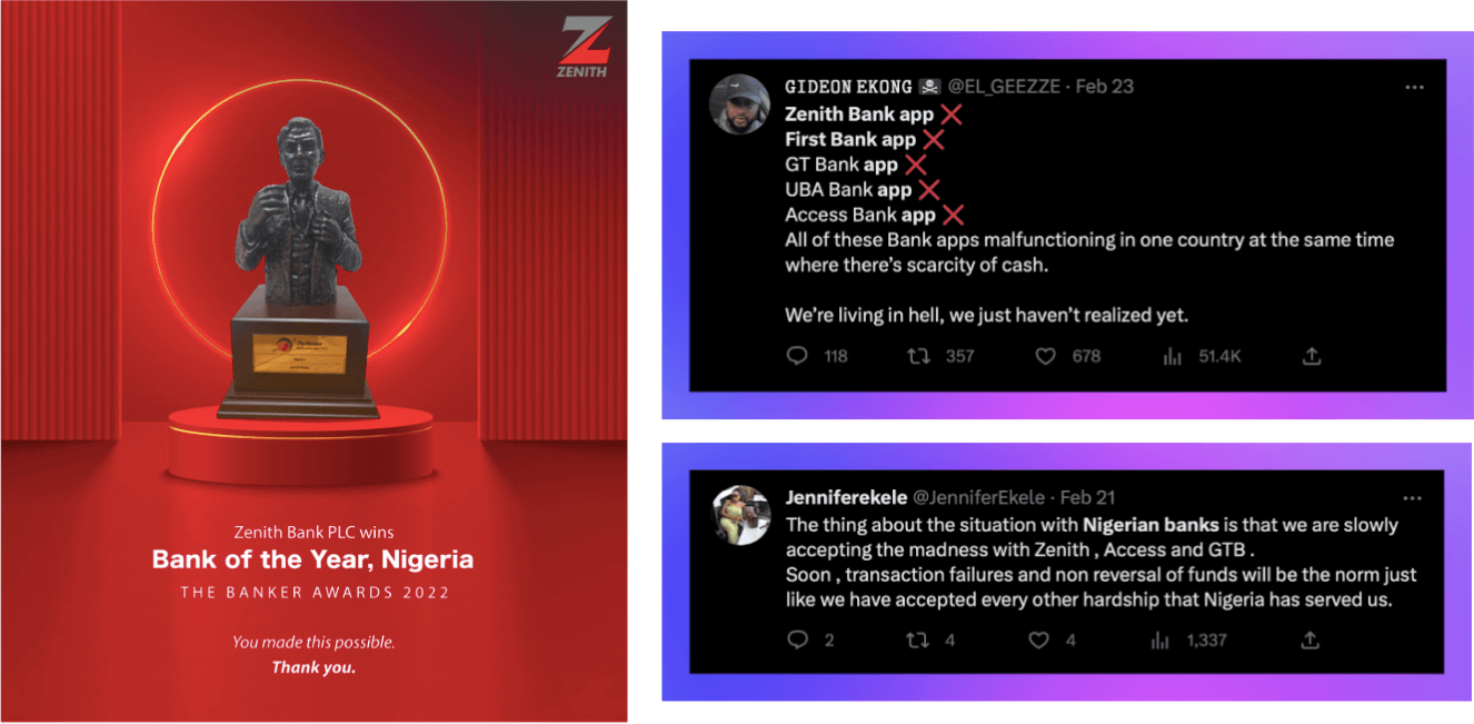 Before the cash crisis, some banks such as GTBank, Access Bank, and UBA had already faced criticisms, but Zenith Bank's recent unreliability is surprising and unfortunate, especially since the bank was awarded "Bank of the Year, Nigeria" in 2022.