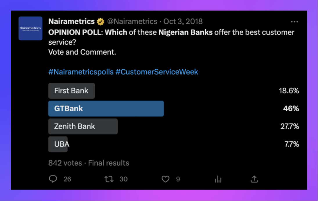 Nigerian banks as a rule of thumb offer self-care or customer support options within their mobile applications. However, there are concerns regarding the effectiveness of these provisions as many customers still resort to Twitter to voice their complaints about their bank's services. This trend began a few years ago and banks have since mandated their representatives to quickly resolve or manage these complaints on Twitter through mentions and Direct Messages (DMs). Guarantee Trust Bank was particularly efficient in this regard, earning recognition at the time.Here’s a poll from October 3, 2018.