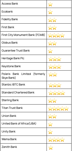The table below has been drawn to rate the customer support service of some of these banks. 5 stars being great and 1 star being poor.