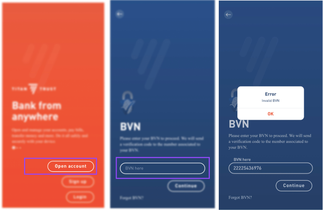 Titan Trust Bank's mobile app offers the option to open a bank account, with the "open account" button located at the top of the first screen. Upon proceeding to the next screen, the customer is prompted to provide their BVN. In the event that a fake BVN was used, an error message reading "Invalid BVN" was generated. Compared to the other banks examined, Titan Trust Bank's mobile app has the shortest process leading up to the BVN requirement.