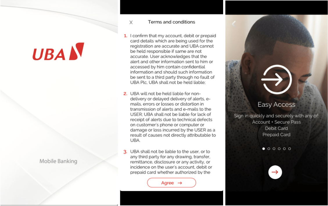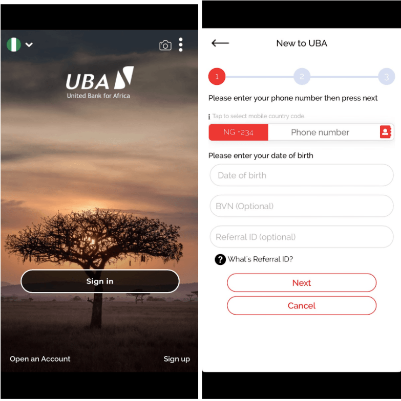 UBA's mobile app mandates its customers to accept its terms and conditions before accessing its content. The app has an option to open a new account, but upon selecting the account type, the form screen indicates that providing a BVN is optional while a phone number is compulsory.