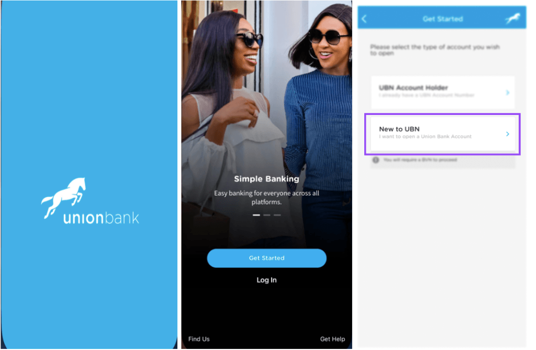 Union Bank's mobile app offers the option to open a Union Bank account, with the importance of having a BVN stated upfront. The customer is prompted to answer questions about their age and provide a valid ID, to which they can select "yes," "no," or the ID type.