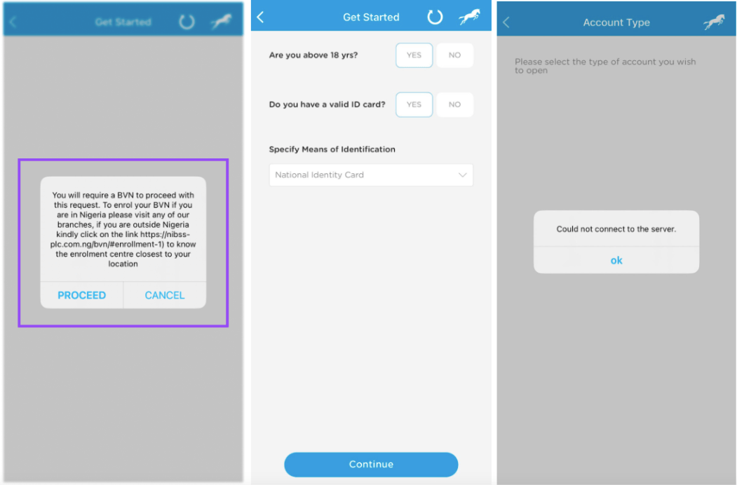 The app provides for only one type of account called “Tier 1”. The bank also provides an alternative for customers without a BVN, and the mobile app did not provide an error message upon testing out the fake BVN, but went back to the last screen used.