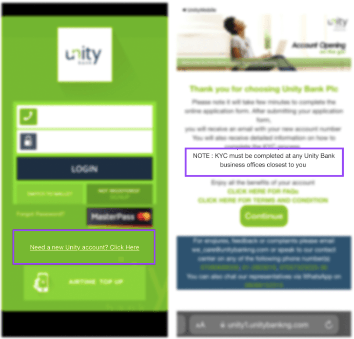 Unity Bank does not offer the option to open an account through its mobile app, even though the "Open Account" button is present on the first screen. Clicking on it redirects the user to the phone's browser, where they are then instructed to visit a physical branch to open the account.