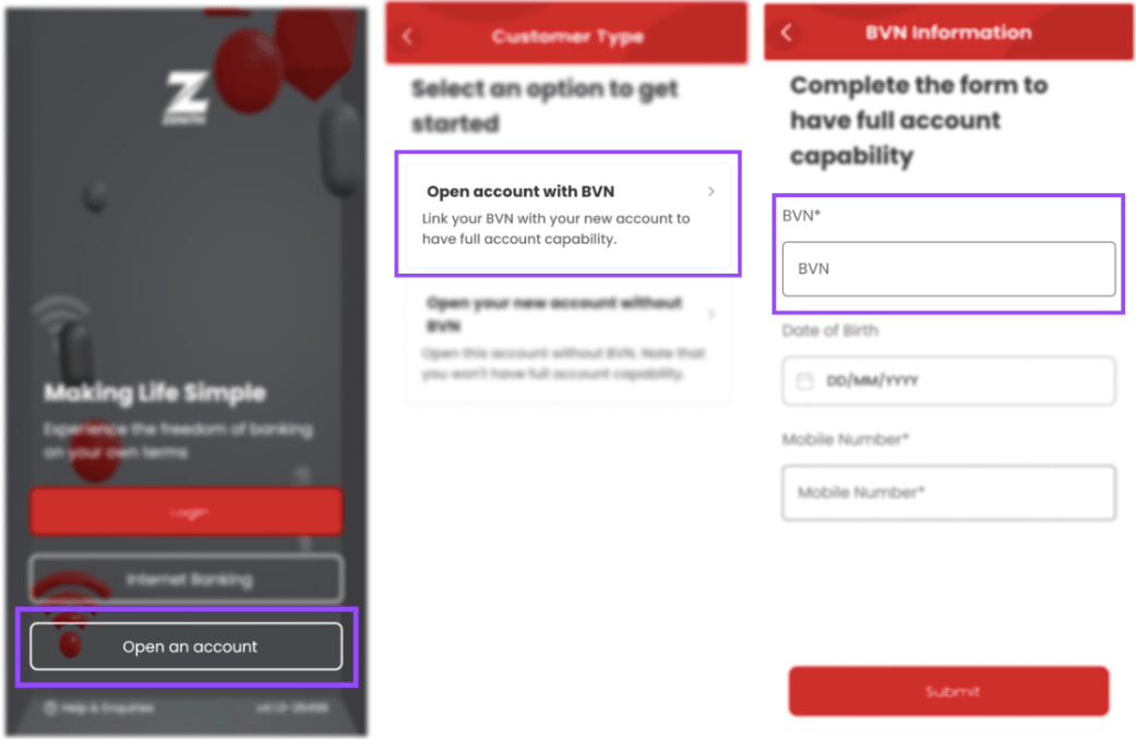 Zenith bank's mobile app provides customers with the option to open an account, which can be found on the first screen of the app. The bank app provides two options: opening an account with BVN and opening an account without BVN. It warns the customer that the option without BVN won't have full account capability.