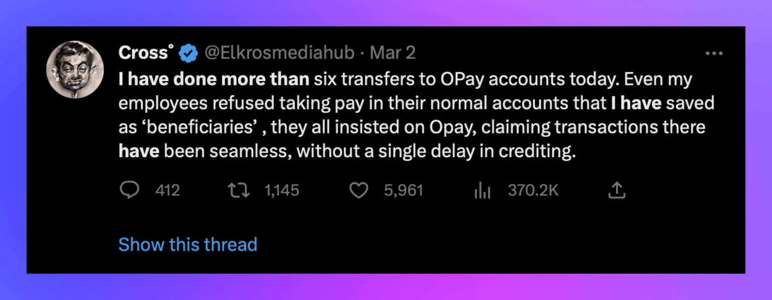While they have had fairly good services, it is important to talk more about the one Challenger bank that has distinguished itself. Since this past month (February 2023), people have been very vocal about their banking experiences. It is quite easy to notice how much praise OPay has been receiving.